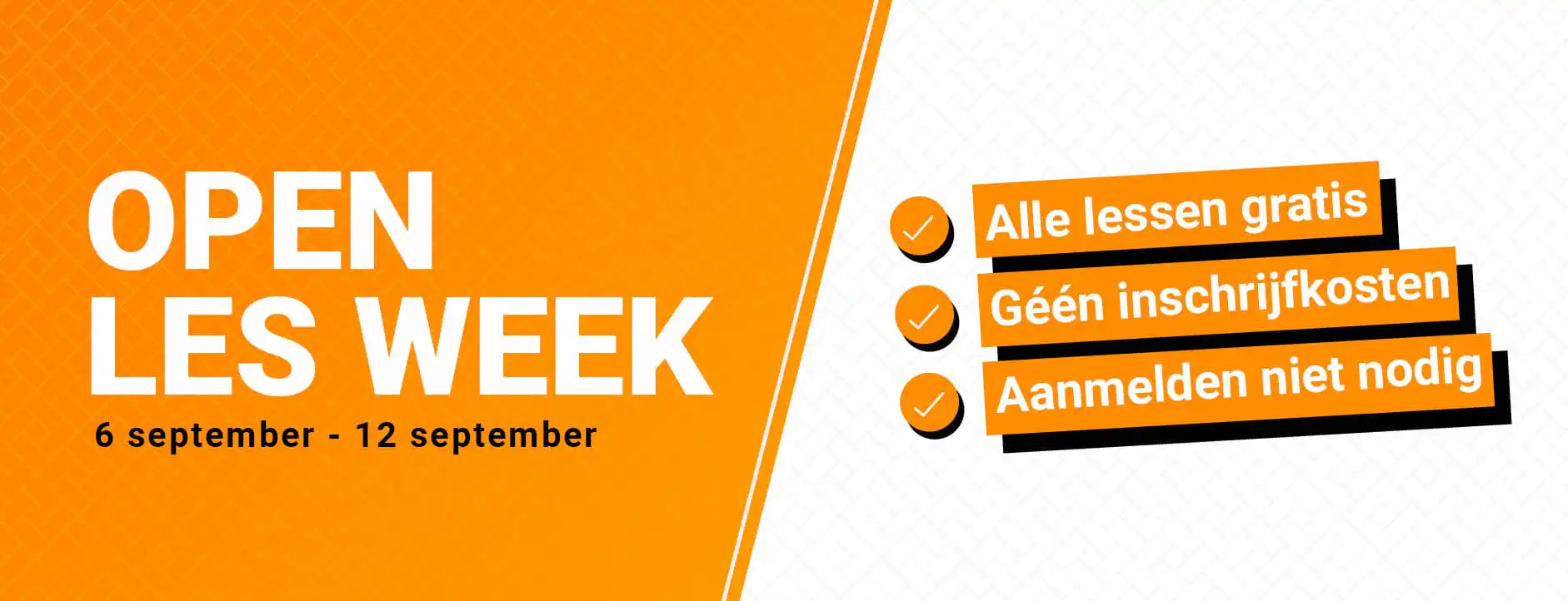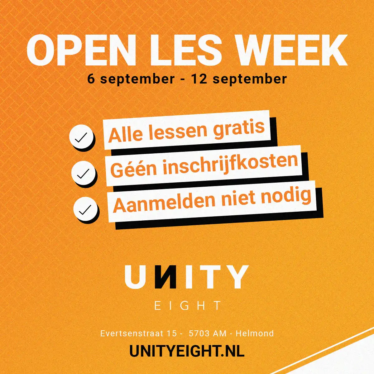 Vanaf maandag 6 september is er weer de open les week bij UnityEight. Iedereen mag gratis alles komen proberen! Elke dansles, elke sportles en de fitness! En deze week betaal je géén inschrijfgeld! Dus die heb je al verdient! Welke lessen kom jij volgen? Aanmelden of reserveren is bij ons niet nodig! Het volledige rooster kun je hier vinden. See you next week
